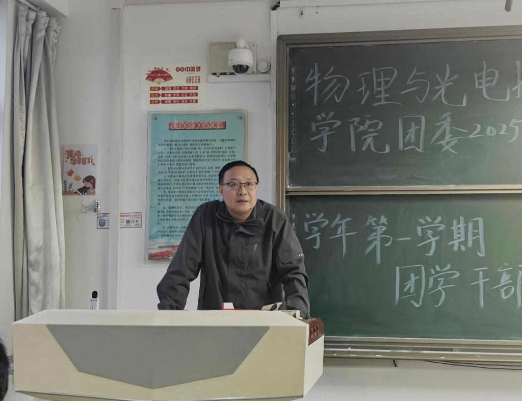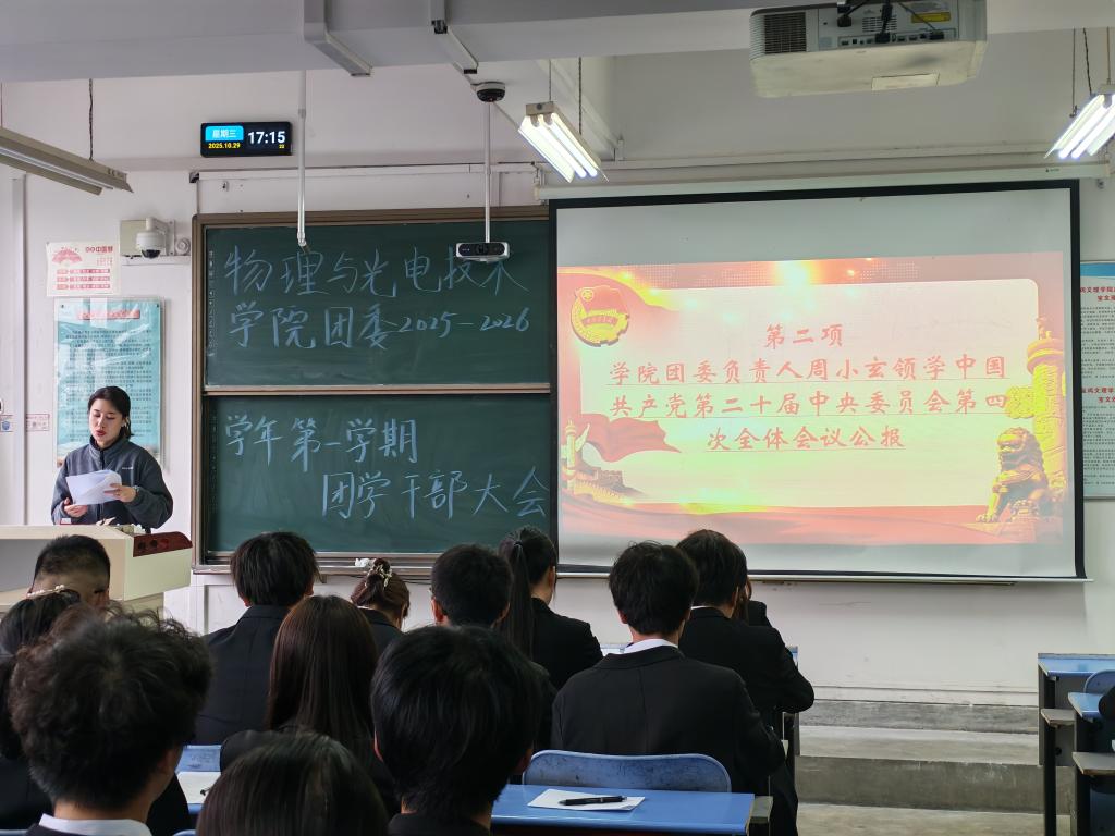 为凝聚团学干部力量、明确近期工作重点,2025年10月29日下午,物理与光电技术学院团委于石鼓校区综合楼506教室召开2025-2026学年第一学期团学干部大会。学院党委副书记李建鹏、学院团委负责人周小玄以及全体团学干部参会。会议由学院团委副书记党嘉莹主持。